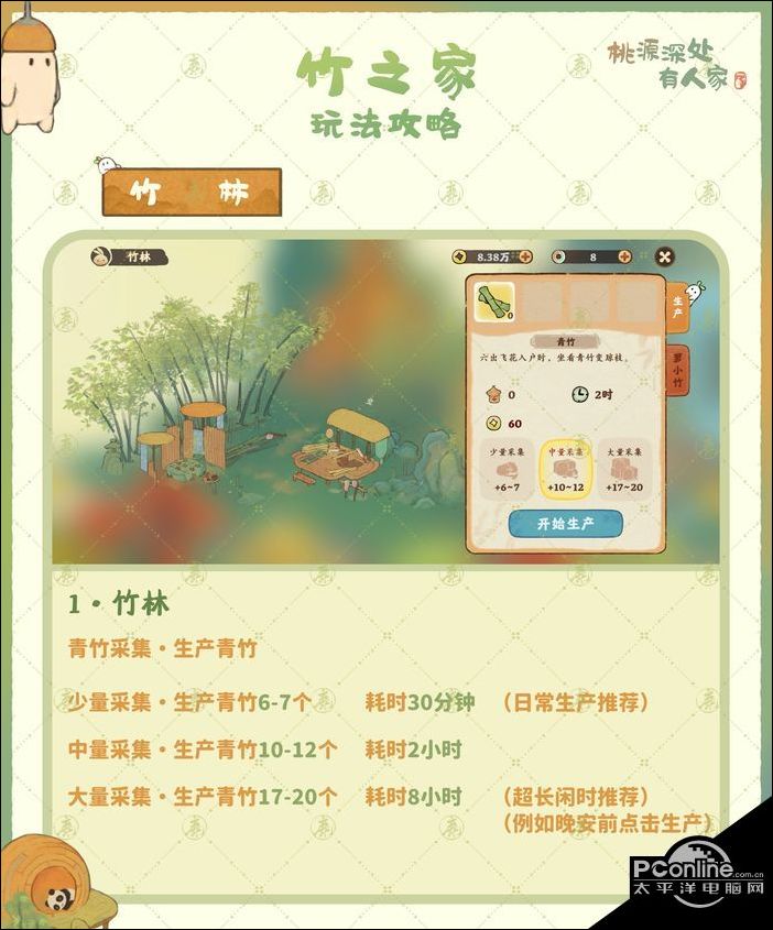 桃源深处有人家是一款田园生活类手游,里面也是有多种活动,其中竹之家活动应该怎么玩呢,很多玩家都不清楚,那小编就从五个方面为大家带来了具体的玩法技巧总结,还不知道的小伙伴可以来看看啊。 图1-竹之家系列建筑修复 竹林·16级解锁 竹萌团窝·17级解锁 竹之家·18级解锁 图2-竹林 生产青竹 图3-竹萌团窝 喂养熊猫·培养亲密度 亲密度等级奖励 图4-竹之家 制造竹制品装饰 触发巧思 图5-竹之家 竹艺等级奖励 加油升级,去拥有属于自己的阿胖达吧! 以上就是PConline整理带来的桃源深处有人家竹之家玩法总结,更多相关游戏攻略,请关注PConline! |