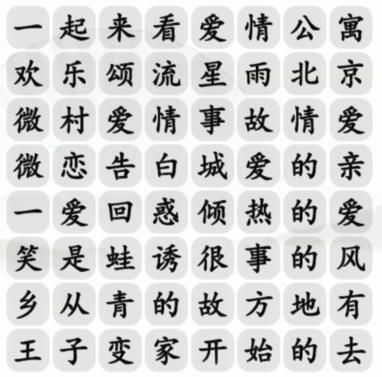 汉字找茬王 游戏是抖音上热火的文字闯关游戏,其中关卡甜甜恋爱剧消除爱情电视剧怎么过?这一关是连连看消除爱情电视剧名。下面是给大家带来的抖音小游戏《汉字找茬王》甜甜恋爱剧消除爱情电视剧通关攻略,不清楚如何过关的小伙伴们一起来看看吧。 甜甜恋爱剧消除爱情电视剧 1、这一关是连连看消除爱情电视剧名,我们看到许多熟悉的剧名 2、注意这一关是消消乐玩法,字会往下掉,所以我们需要按照顺序消除 3、答案如下所示: 爱情公寓,一-起来看流星雨 欢乐颂,北京爱情故事 亲爱的热爱的,去有风的地方 王子变青蛙,回家的诱惑 恋爱是从告白开始的 微微一笑很倾城 乡村爱情故事 以上就是汉字找茬王甜甜恋爱剧消除爱情电视剧通关攻略答案分享,希望对大家有帮助。 |