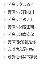 效果如下: 劳资丶文武双全 劳资丶打打闹闹 劳资丶走遍天下 劳资丶闯荡江湖 劳资丶超喜欢你 劳资~爱的就是你 我以为我足够好 好到让你留下紧抱 —————————————————— 我热情有限 你把握好时间 我要稳稳的幸福 能用双手去碰触 我要稳稳的幸福 抵挡末日的残酷 我要稳稳的幸福 —————————————————— 心如薄荷天然新 心如柠檬天然酸 心如深海天然冷 心如蓝天天然蓝 心如暮光天然暖 心如时光天然凉 心如深渊天然远 心如孤街天然冷 —————————————————— Nowhere to place yout 你把我宠成女王 Incomparable love. 然后你告诉我 earthly exile、 你喜欢灰姑娘 开始有个分组。 显示【1/1】。 —————————————————— 一见钟情 一生相伴 ら影子是时光的心 ら海曾是哭蓝的天 ら亡鱼是深海的疤 ら你是我寄居的巷 ら海是倒过来的天 ら天是映过去的海 —————————————————— 好姑娘 百毒不侵 硬汉子# 盛夏热海椰香旅馆 清夏蓝鲸海港小镇 一腔孤勇那几年. —————————————————— 命系i 久伴i 愫暮i 独瘾i 浮梦i 久慕i 惨白i 佳人i —————————————————— [ 毕业那天 ] [ 我要用 ] [即将离开的名义] |