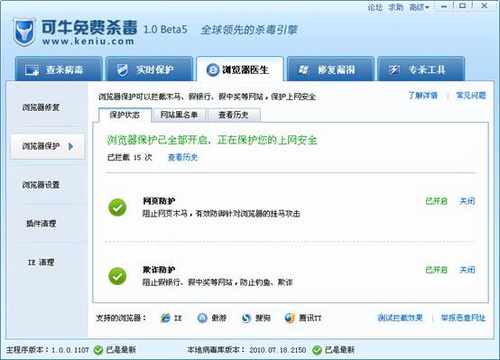 浏览器被劫持、主页被篡改,让无数网友心烦意乱;网页挂马和钓鱼网站更对网民的个人隐私、财产构成了极大威胁;而网络“黑药店”的危害更甚,它不仅骗取高额的钱财,更有可能危及患者的生命。而这些恶意攻击都有一个共同的入口——浏览器。对此,可牛免费杀毒增强了“浏览器医生”功能,其“浏览器保护”模块可有效阻止挂马攻击,全面拦截钓鱼网站和网络黑药店;而“浏览器修复”模块则可轻松解决浏览器被劫持等问题。